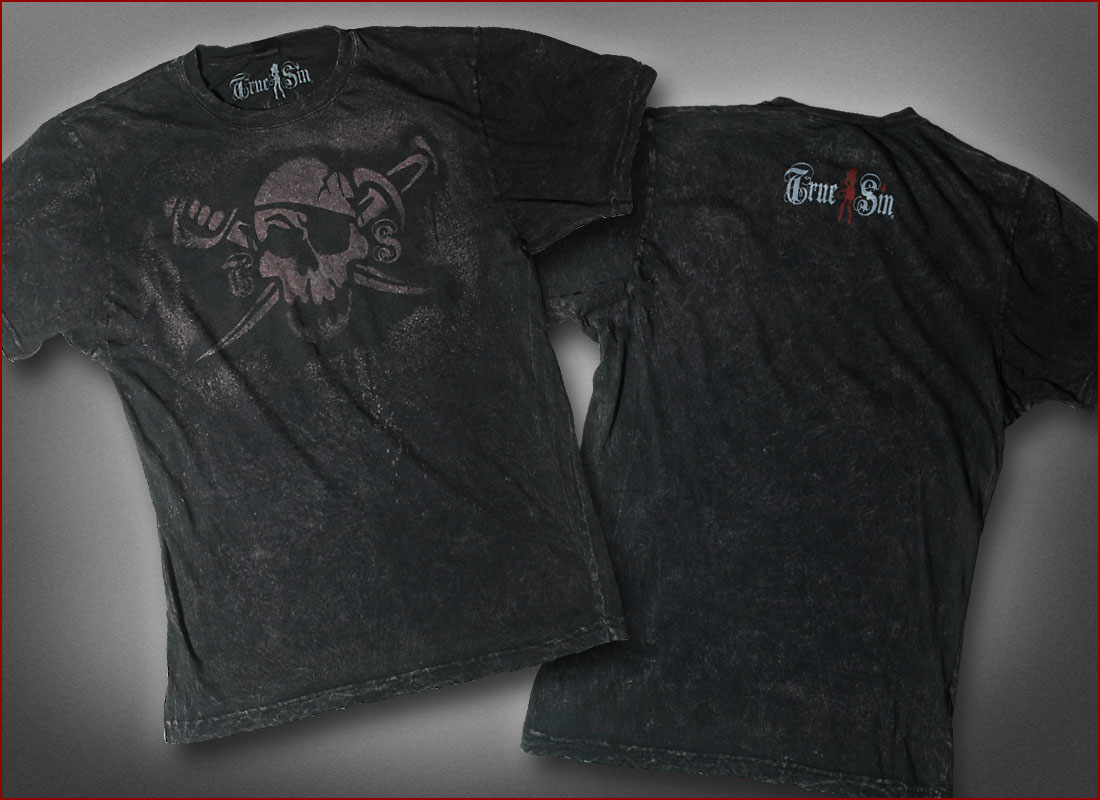 Premium distressed graffiti pirate skull graphic with special hand dye discharge to give each shirt a completely different look. True Sin signature logo printed high on the back, made in USA, 100% cotton, super soft vintage acid wash, regular fit, garment dyed.