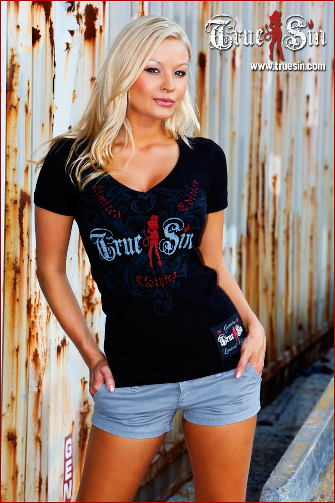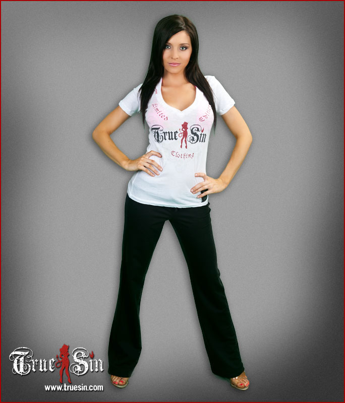 100% super soft, pre-washed cotton. Cleavage accentuating deep v-neck with cap sleeves. Has red hand stitching on neckline and Limited Edition patch sewn at bottom hem. Available in white or black in limited quantities.