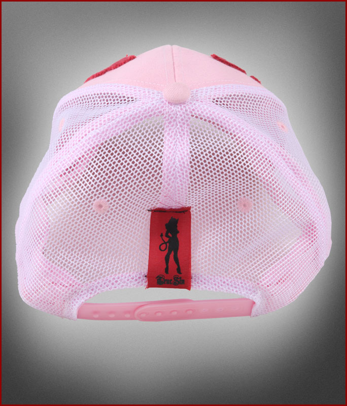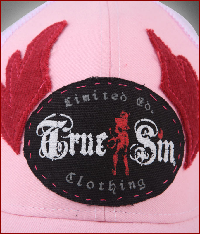 Cotton bill and front panel, mesh back, plastic tab strap. Hand sewn-on True Sin logo patch, sewn on pink angel wings, back tag and random contrasting hot pink stitching, making each hat completely different than the next. Hand grinding on bill to give a well worn look and feel. This hat is made for sizes up to 7 1/2.